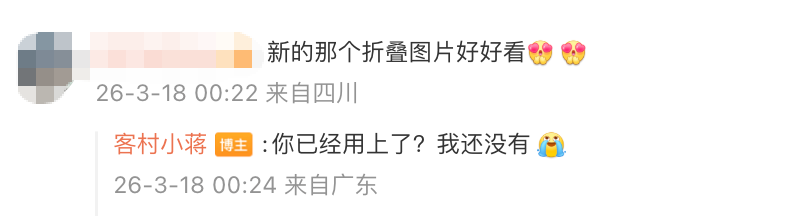 3月18日,对于此次折叠发图功能,微信员工@客村小蒋 在微博上与网友互动时称:“你已经用上了?我还没有。”